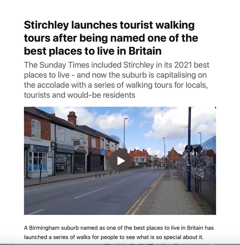 - Stirchley launches tourist walking tours after being named one of the best places to live in Britain – Birmingham Mail, 5 April 2021